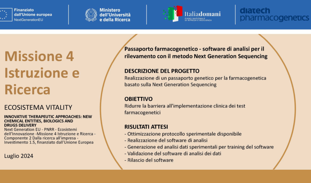 Diatech Pharmacogenetics is pleased to announce its participation in the cascade funding calls within the ECOSYSTEM VITALITY – INNOVATIVE THERAPEUTIC APPROACHES: NEW CHEMICAL ENTITIES, BIOLOGICS AND DRUG DELIVERY, SPOKE 8, with a project aimed at developing a genetic passport for pharmacogenetics based on Next Generation Sequencing. CASCADE CALL – ECOSYSTEM VITALITY – INNOVATIVE THERAPEUTIC APPROACHES: […]