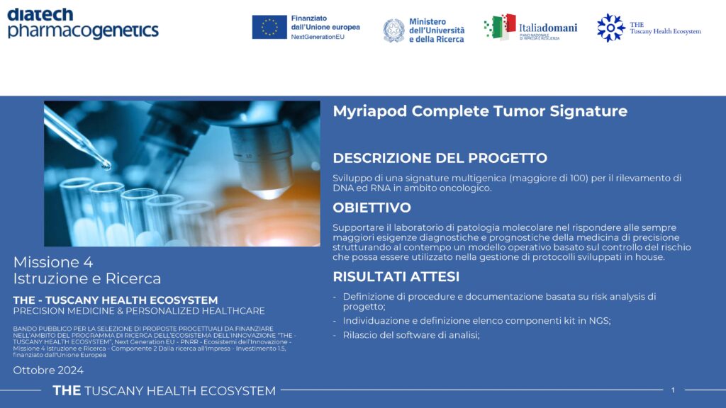 Diatech Pharmacogenetics is pleased to announce its participation in the cascade funding calls within the THE – TUSCANY HEALTH ECOSYSTEM, PRECISION MEDICINE & PERSONALIZED HEALTHCARE, with a project focused on developing a multigene signature (over 100 genes) for the detection of DNA and RNA in the oncology field. Cascade funding call issued by Spoke 6 […]